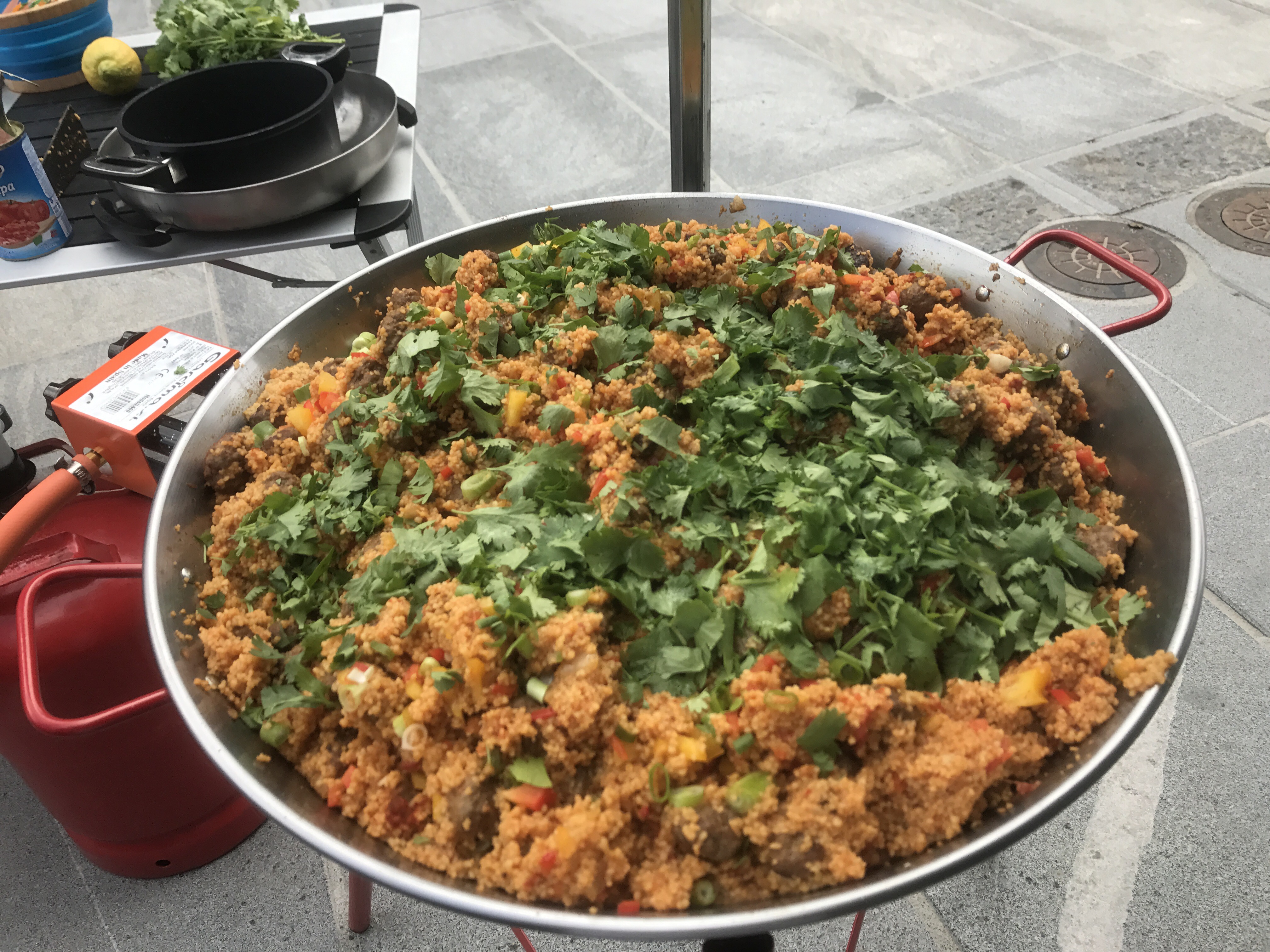 Jepp! Masse folk! Det er utrolig kjekt å lage mat, og enda kjekkere å kunne lage mat på stedet! I dag kjørte vi bobilen inn i gågata i Sandnes, og tok ut paellapannen! Det ble ikke paella, men kjøttboller og couscous! Omtrent 400 porsjoner! 😱