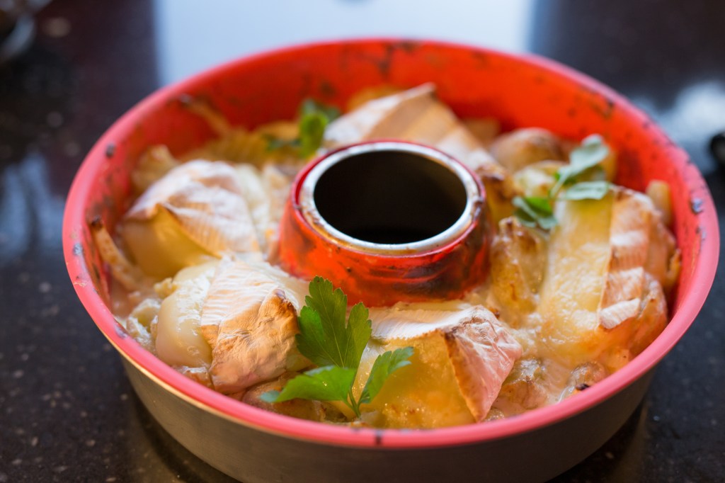 Bland alle ingrediensene utenom osten i en skål, og fordel det i omniaen, uten risten. Skjær brie’en i små trekanter. Ha dem over potetmassen i formen. Stek fem minutter med sterk varme, deretter 25 minutter på svar varme. Server med litt grønt og gjerne litt brød. Tartiflette kan også være tilbehør til stekte pølser, men i Frankrike spises den stort sett for seg selv.